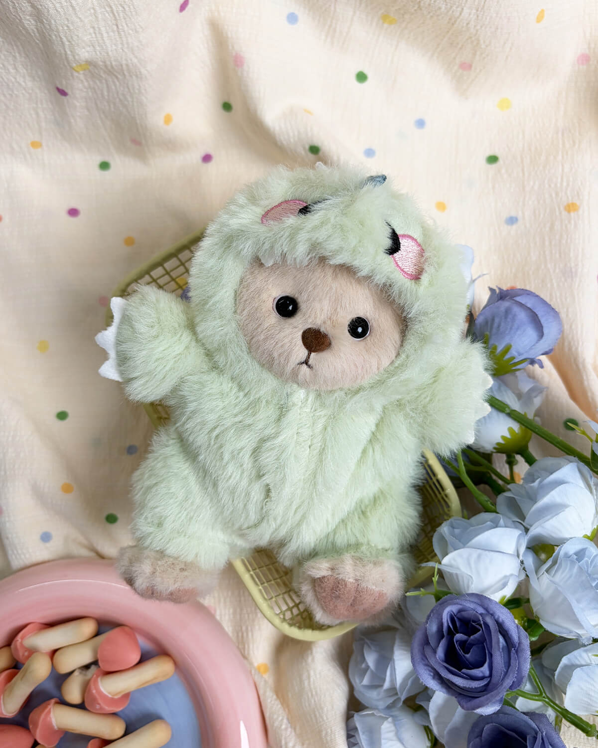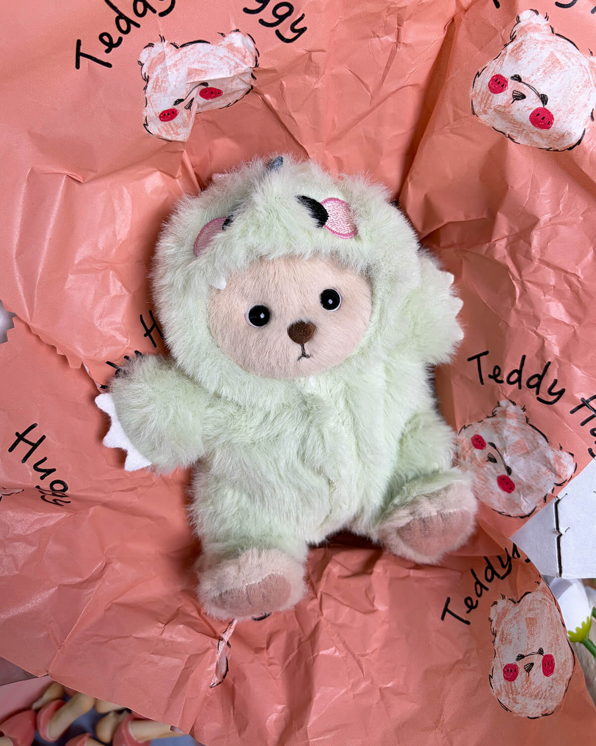 Transform your mini Teddy Bear with our adorable Dinosaur Jumpsuit! Made from soft fabric, this colorful outfit features a special keychain loop, allowing you to carry your bear as a cute keychain. Perfect for playtime and on-the-go cuddles!