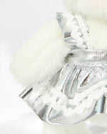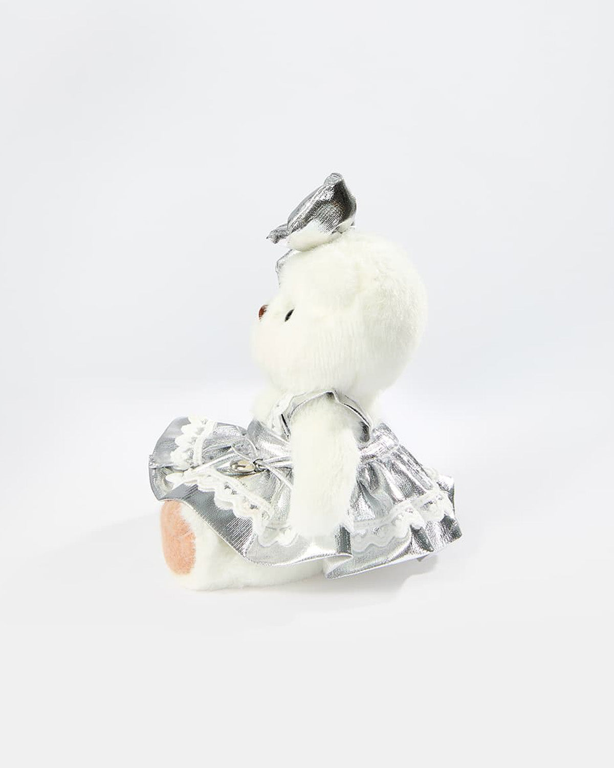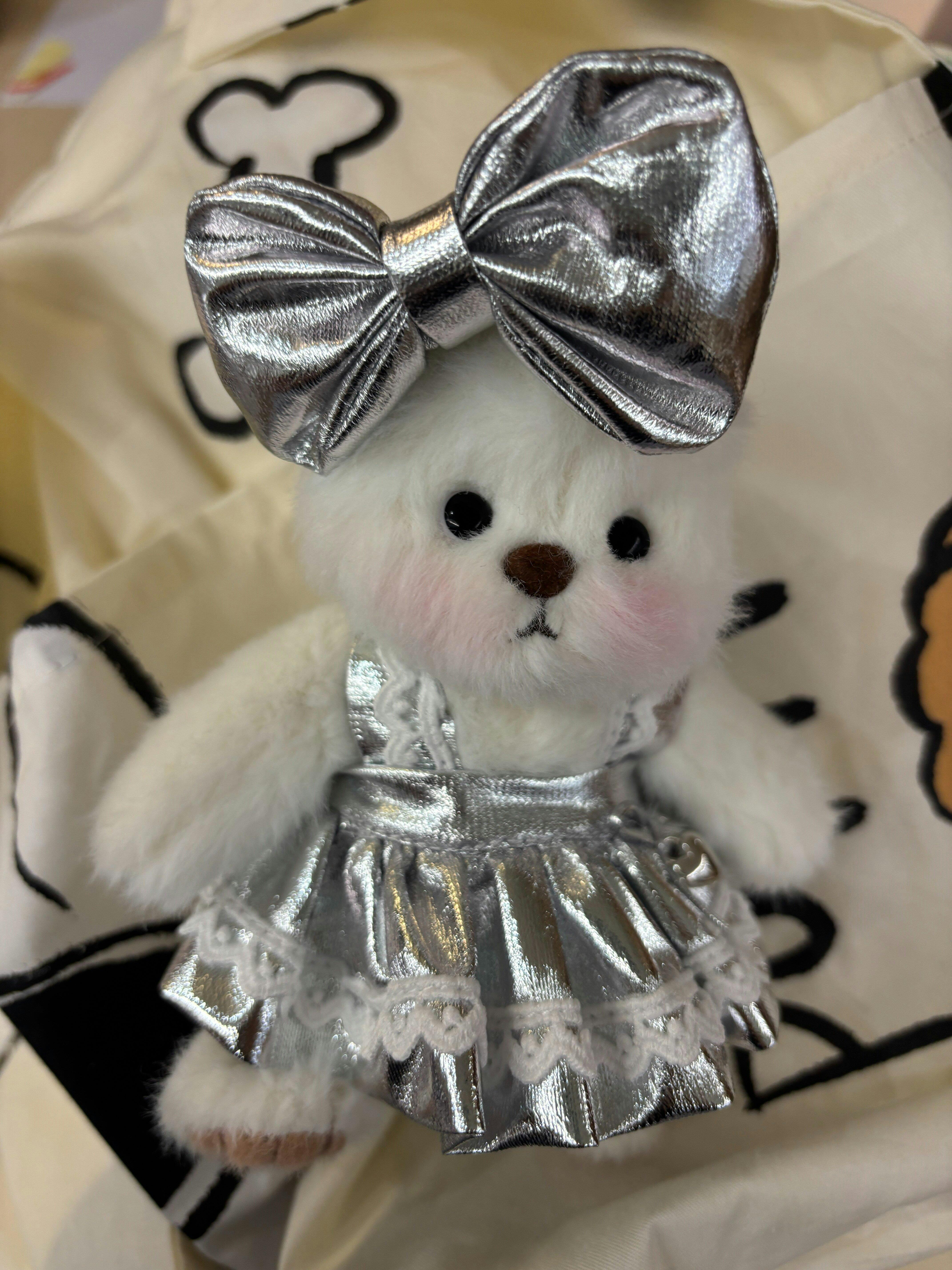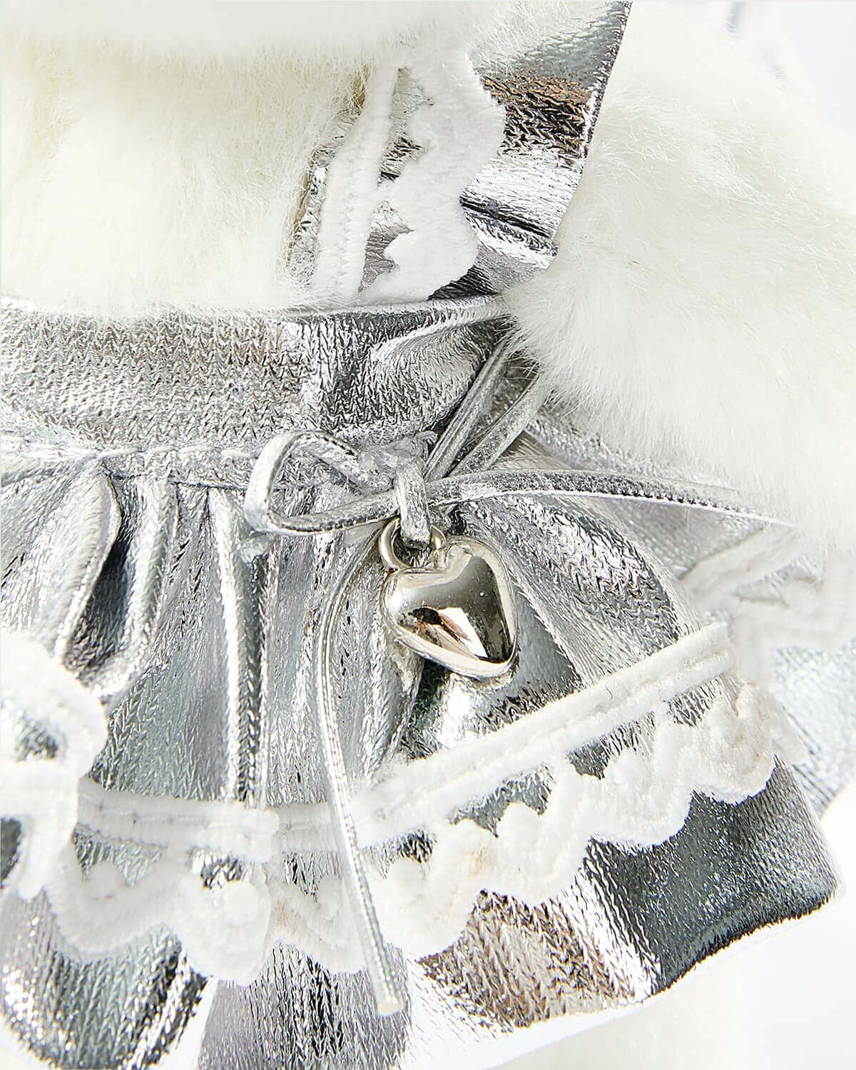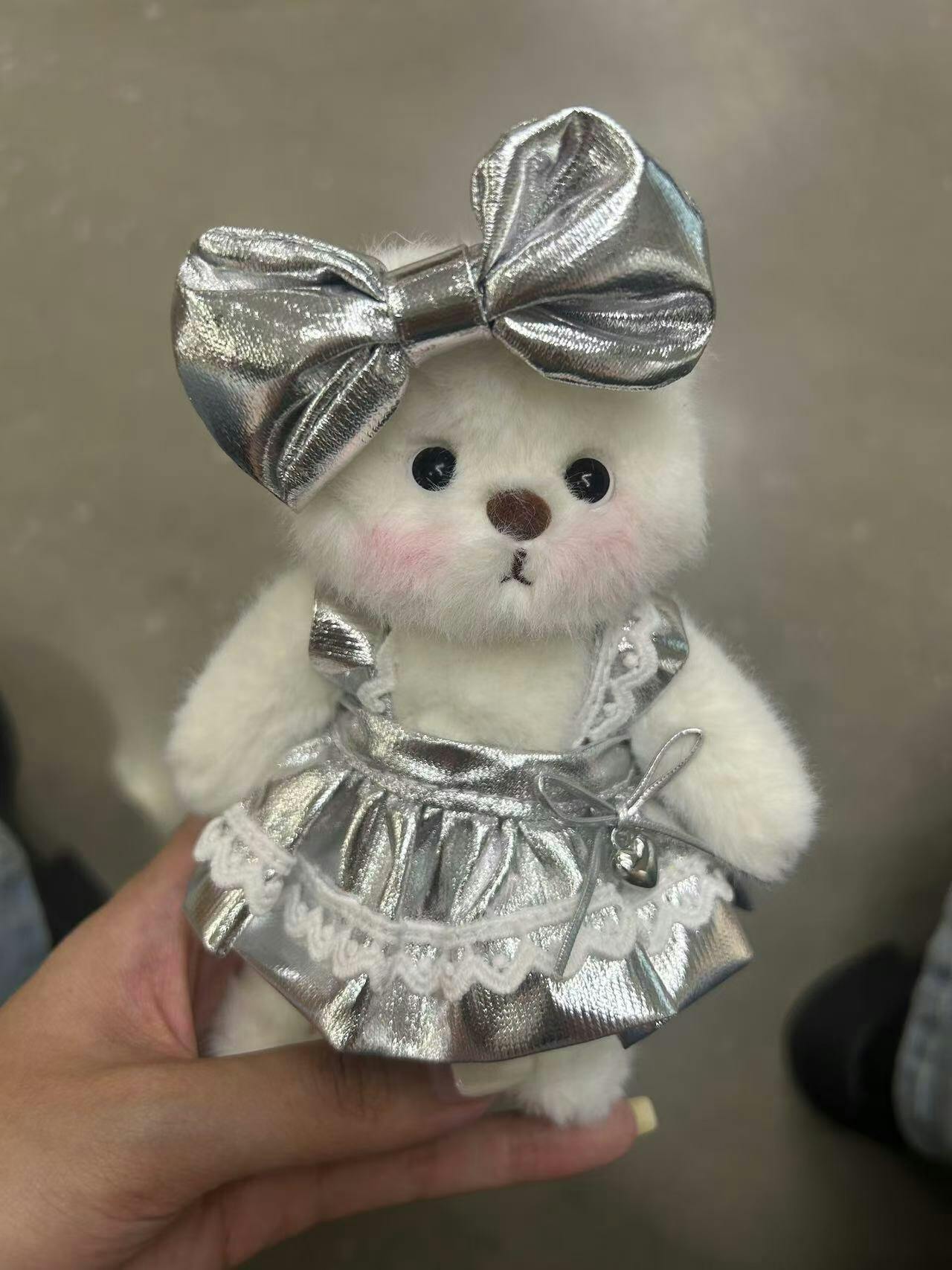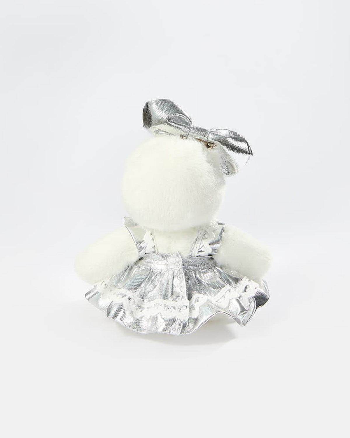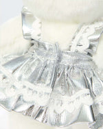 Shine bright with our Silver Moonlight Dress! The shimmering silver fabric and oversized bow create a stunning centerpiece. Accented with white lace and a heart-shaped pendant, this dress embodies princess vibes. Its classic silver and white color scheme pairs well with most plush toys, while the intricate details ensure a refined look from every angle.