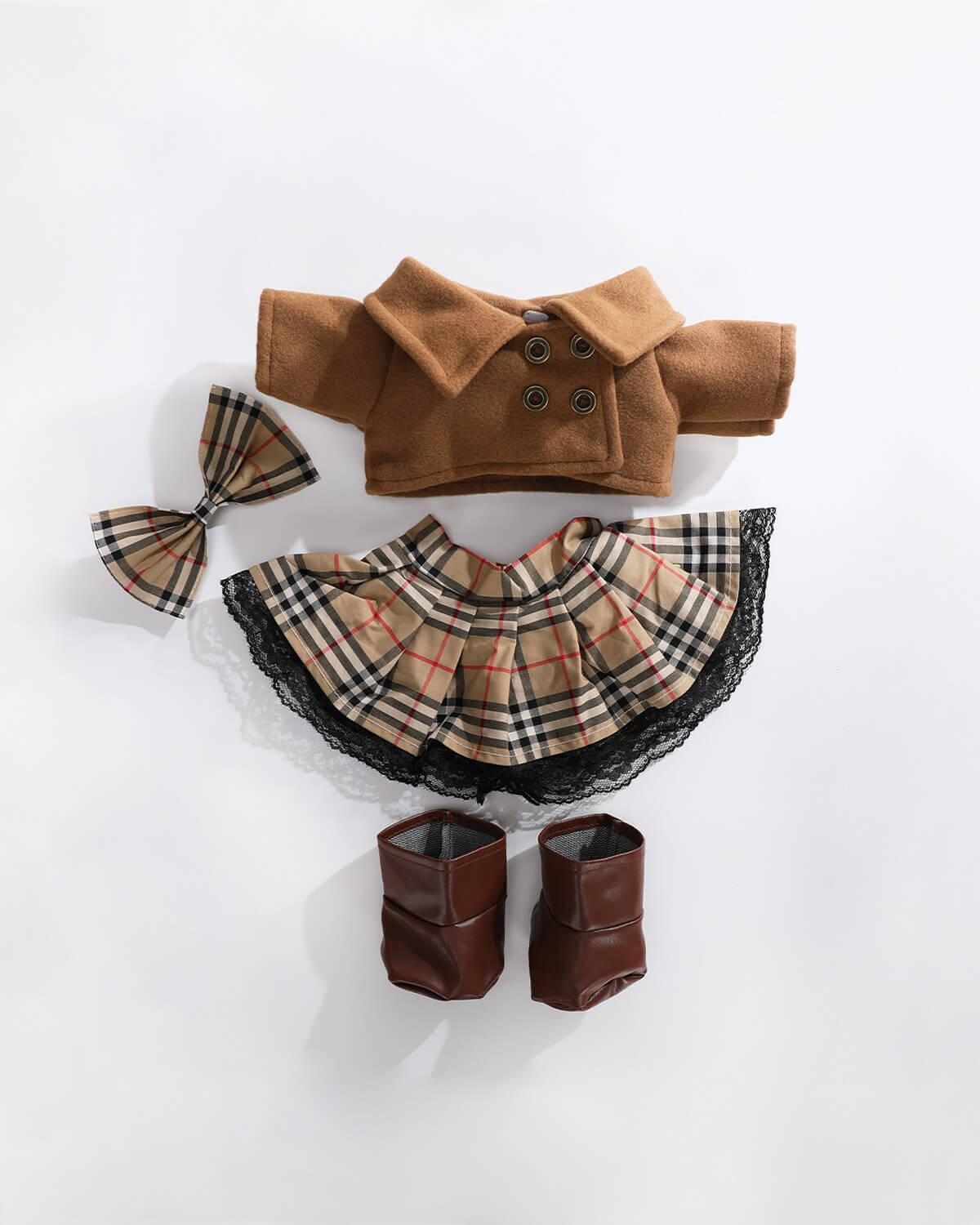 Einzelpreis proThis vintage-inspired Brown Coat Set features a double-breasted design and plaid skirt, showcasing intricate details like a plaid bow. Versatile and stylish, it allows for various outfit combinations, making it a must-have for plush bear enthusiasts.