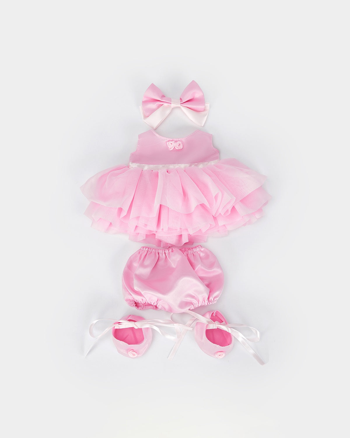 Precio unitario porThis fabulous four-piece set features a pink dress, matching bow, shorts, and shoes-ideal for special occasions! Envision your bear at a birthday party, surrounded by balloons and laughter!