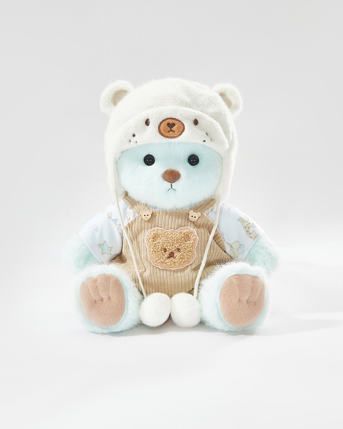 Outfit your bear in this soft white fleece set, including a hat, tee, and cute bear overalls. Imagine your bear embarking on snowy adventures, making snow angels and sipping hot cocoa!