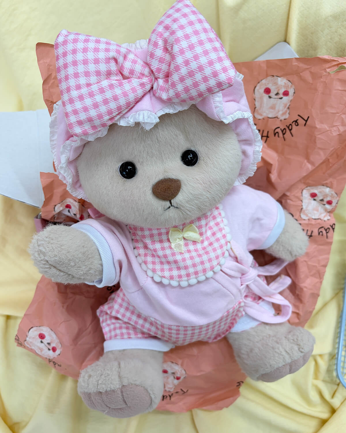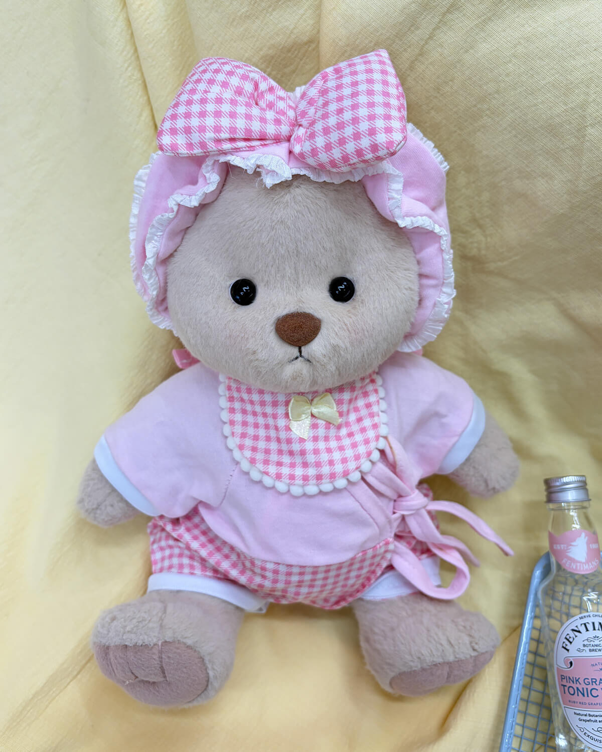 Dress your bear in this adorable pink checkered pajama set, complete with a headband and cozy onesie for a comfy night! Imagine your bear snuggled up, ready for sweet dreams!
