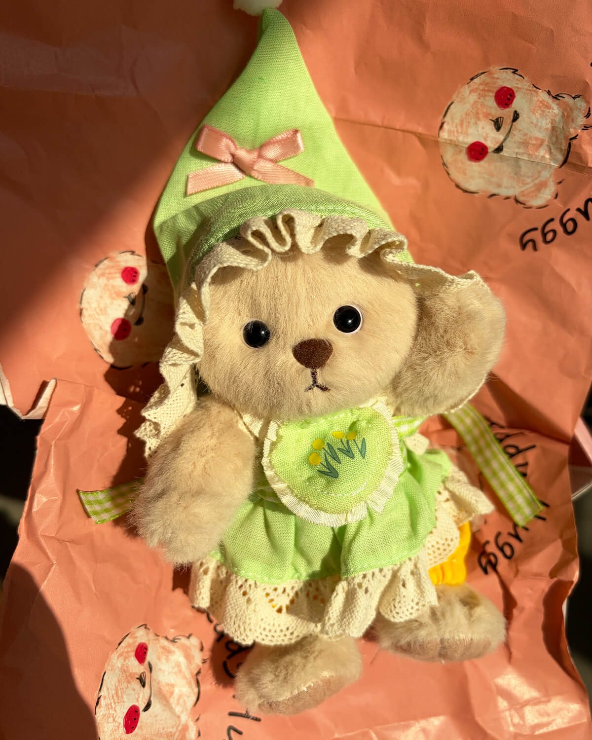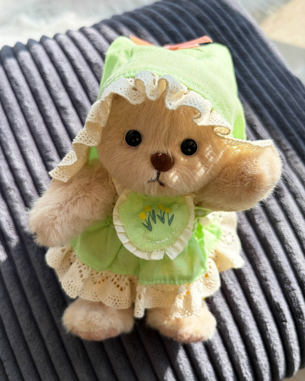 Transform your plush toy into a fairy tale character with our Light Green Elf Set! Featuring a pointed hat with pom-poms, this outfit resembles a forest elf and brings a whimsical touch. The exquisite craftsmanship includes lace trims and handmade patches, adding delightful details.