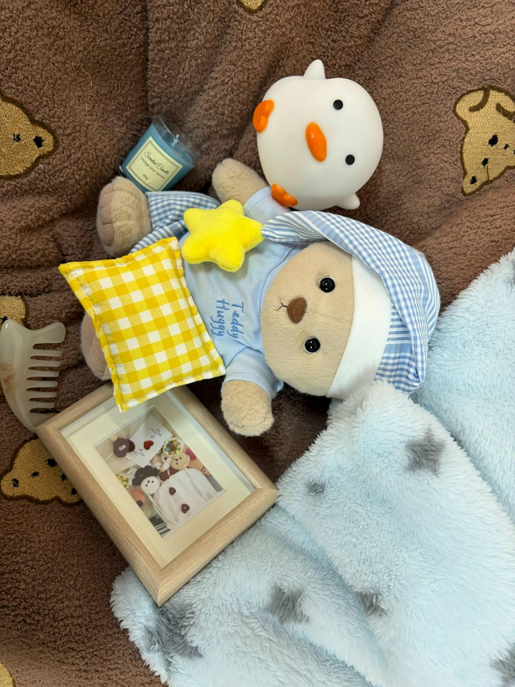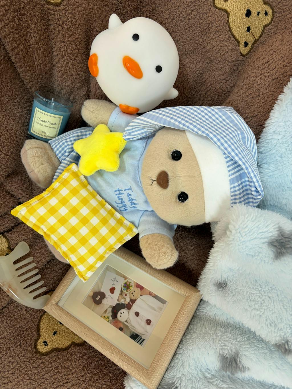 At the heart of this set is our signature plush teddy bear, dressed in soft blue sleepwear and a cozy nightcap, ready to bring warmth and companionship. Designed to create a calming bedtime atmosphere, this collection blends softness, light, and soothing details into one thoughtful gift experience.