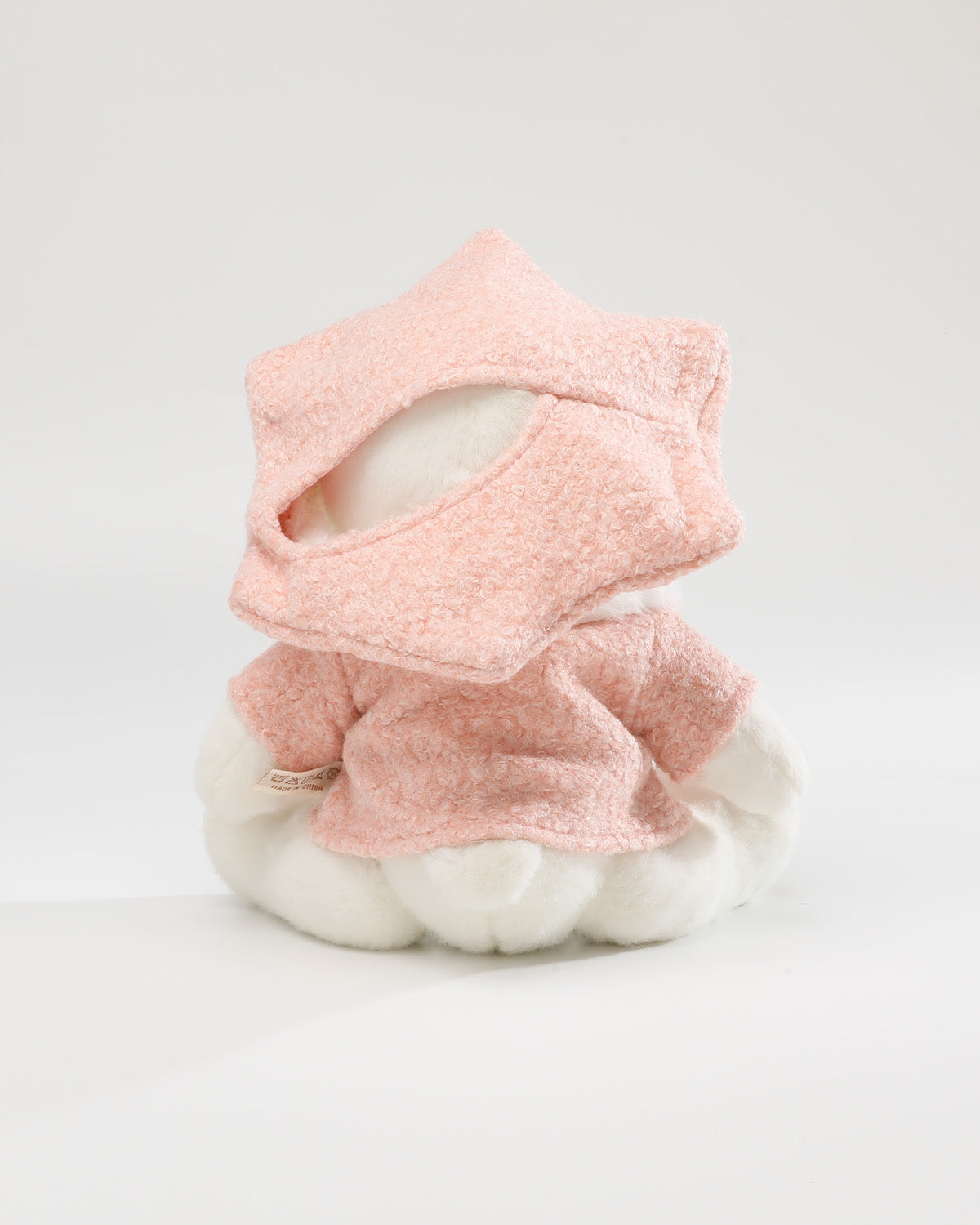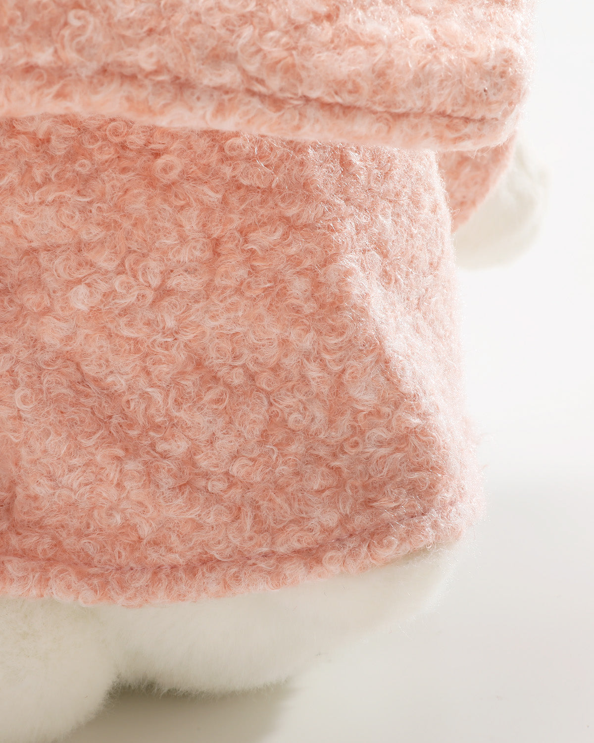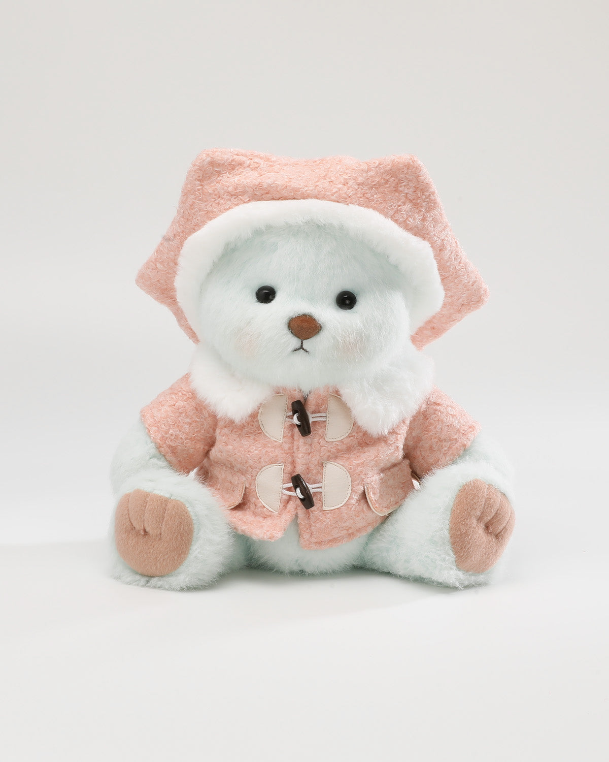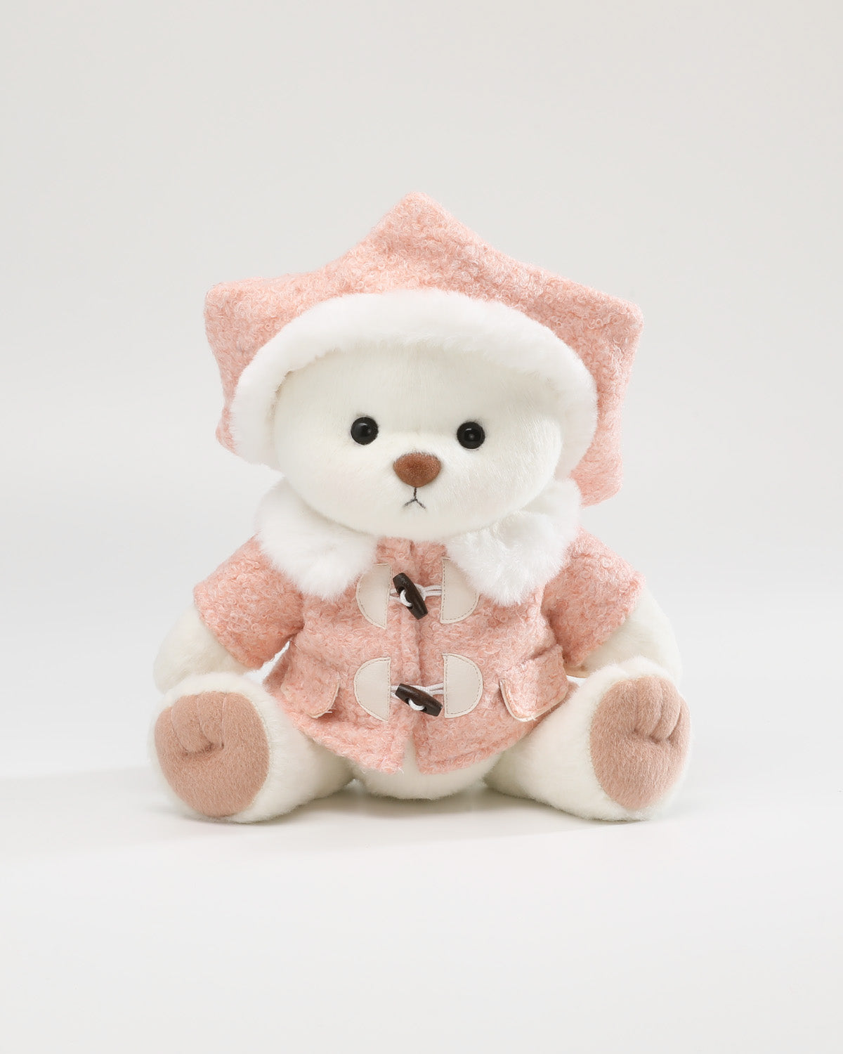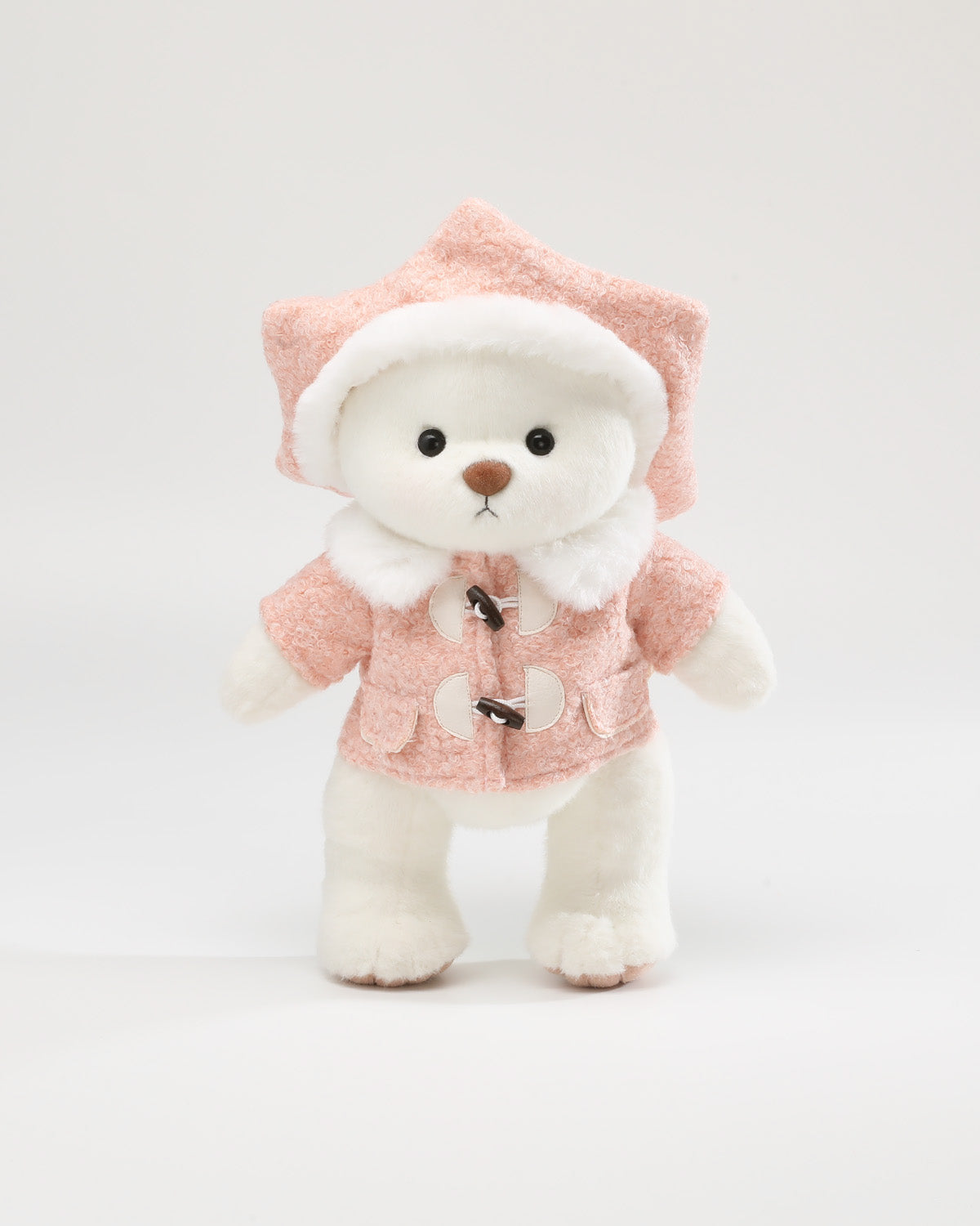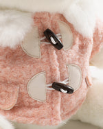 This soft pink wool coat pairs perfectly with a unique hexagonal beret. Small pockets and distinctive buttons add playful charm, while the warm fur collar elevates the overall look with stylish cuteness.